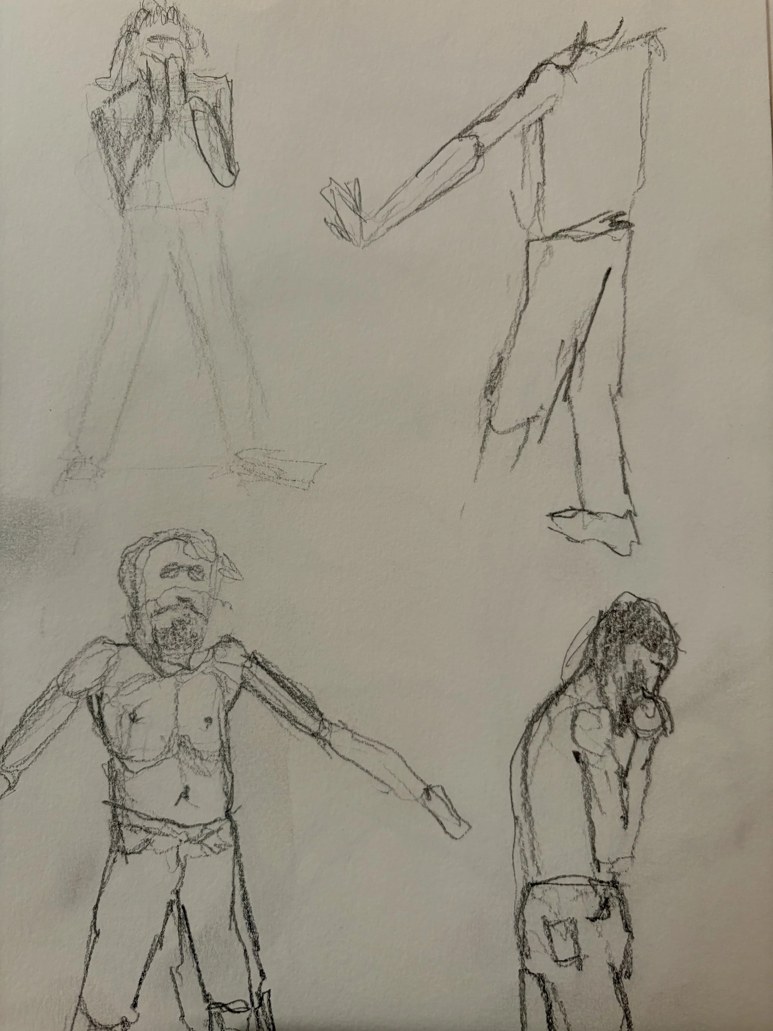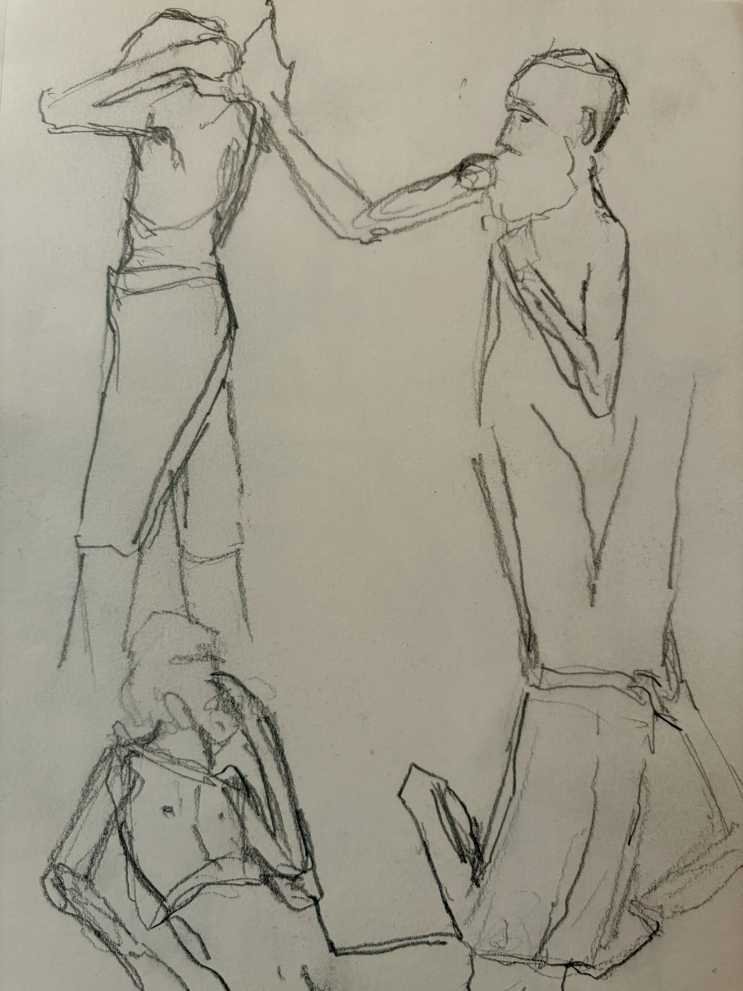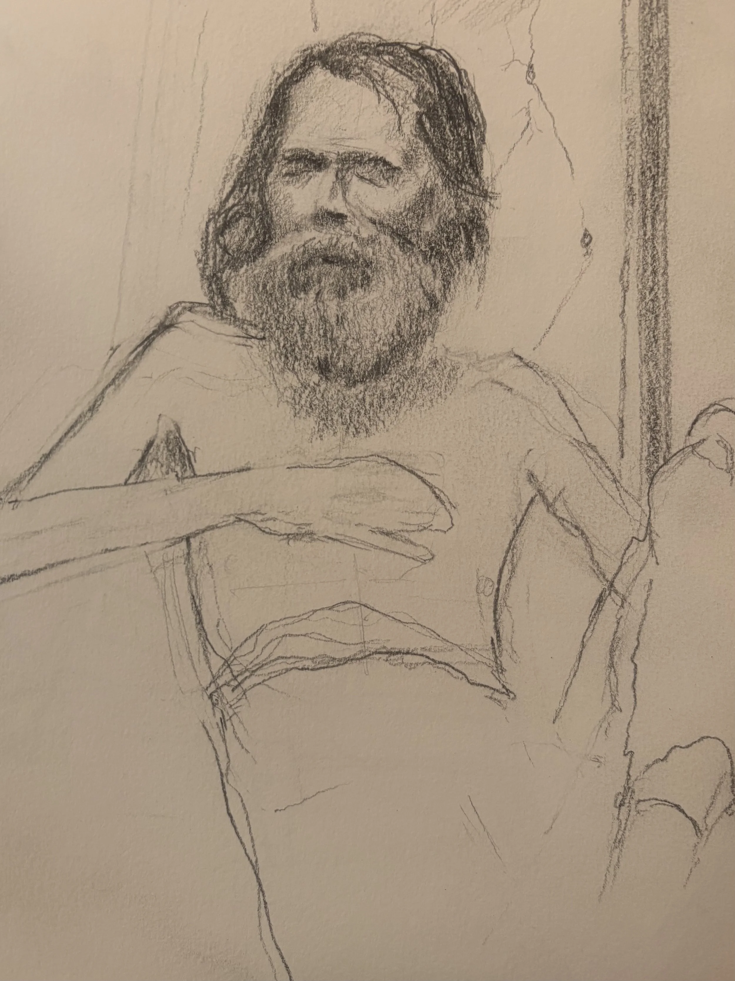 I love learning, and keeping myself in a class of some sort, but being in a family means other things sometimes come first. Lately, the best I can figure out is to go to a life drawing group. There is no instruction, just struggling in a group, like a CrossFit gym, except drawing, erasing, measuring, and trying again. It starts out with ten two minute gesture drawings. This really challenges my sense of control, as in, I want to control everything and make it perfect. The more I do it, the more I realize this is not what these exercises are for. They are a warm up to understand the most basic lines of the figure standing before you.